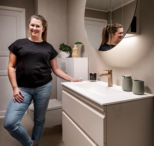 Det er flere måter å gi badet et lite løft på, og det er gjerne de små detaljene som skaper den lune stemningen. Hos Kathrine har de blå veggene blitt byttet ut med duse farger og matte overflater.