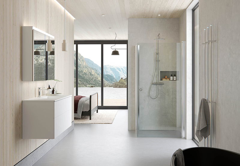 I tillegg til servantskap finner du speil og speilskap med integrert LED-belysning, dusjløsninger i glass med mulighet for måltilpasning, og Line håndkletørkere med lavt energiforbruk og integrert LED-lys.